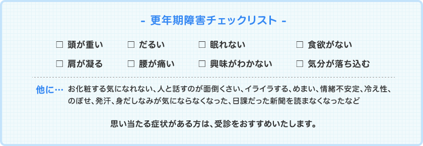- 更年期とは、一般的に閉経の前後10年ぐらいの期間を指します。自律神経の働きや気持ちまで影響を受け、ホットフラッシュ(のぼせ)、発汗、冷え、肩こり、めまい、手足の痺れ、不眠、不安、落ち込みなど様々な症状として現れます。近年、加齢に伴う血中男性ホルモンの低下に基づく男性の更年期障害も多くみられるようになりました。